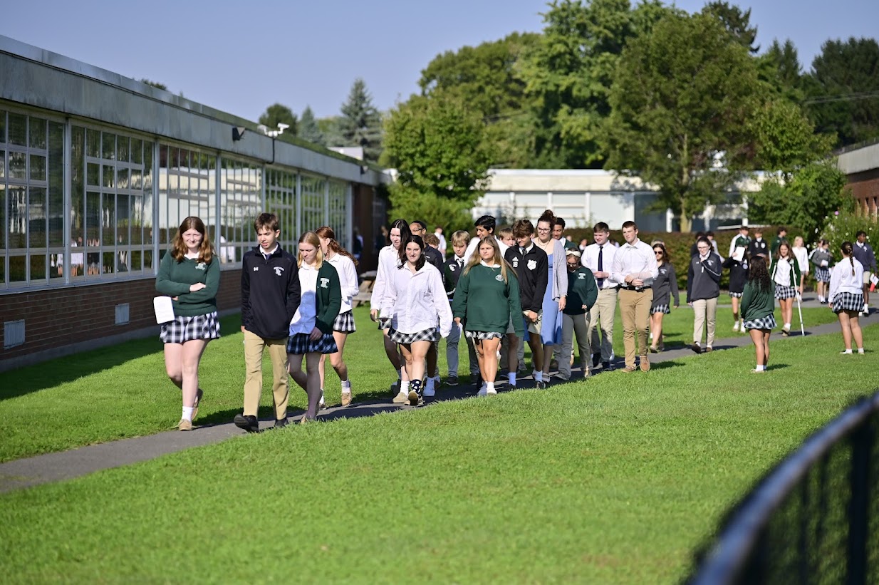 Every school day begins and ends with prayer led by a student, and each class opens with a prayer. This gives students experience in a variety of traditional prayers and in creating their own unique expressions of faith, hope, love, thanksgiving and petition. These may include, but are not limited to, the Way of the Cross, Meditation, The Rosary and Adoration of the Blessed Sacrament.